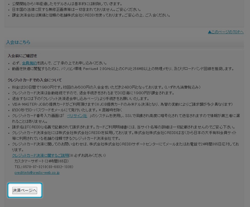 ページ中段あたりに「決済ページへ」と書かれてあるボタンがありますので、それをクリックします。