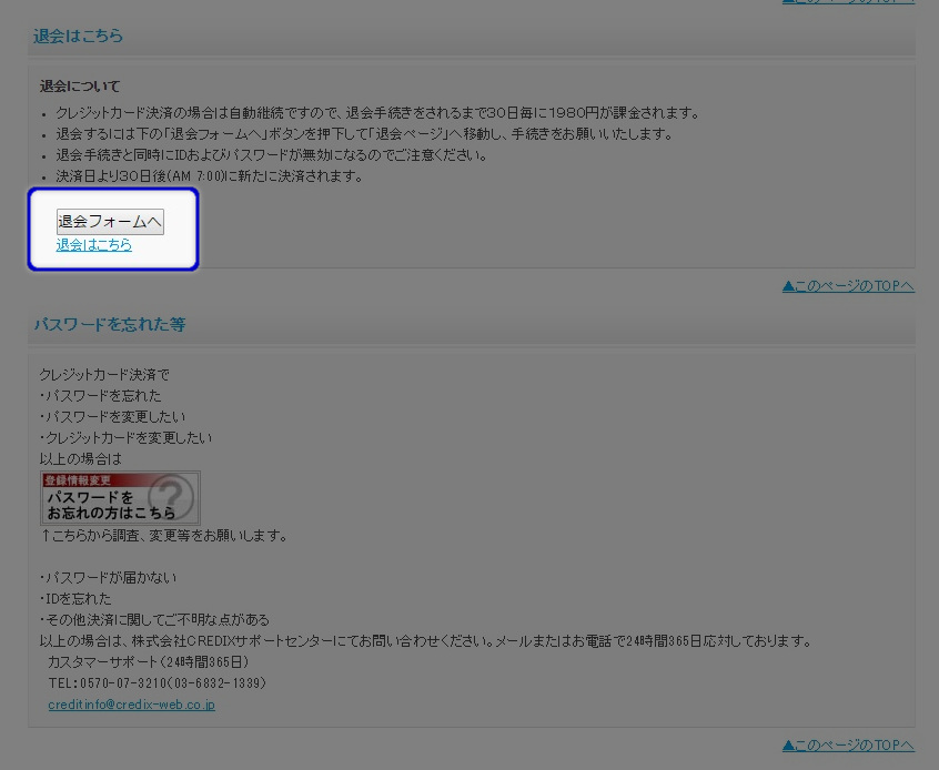 すると、そのページ下段あたりに「退会フォームへ」と「退会はこちら」と書かれた箇所がありますので、そのどちらでも構わないのでクリックします(リンク先はどちらも全く同じページです)。